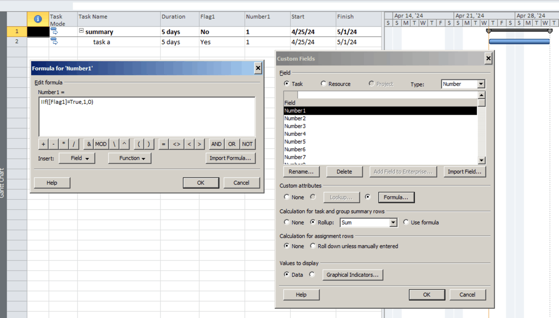 The issue is unrelated to whether the app is Project Standard or Project Professional. Jeff used the Flag1 field instead of the desired Active field, which is not available in the Standard version. The field used in the custom field formula does not matter. Calculation is set to automatic.