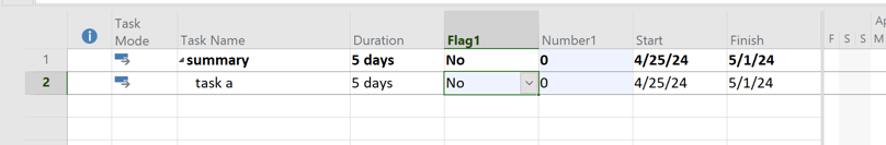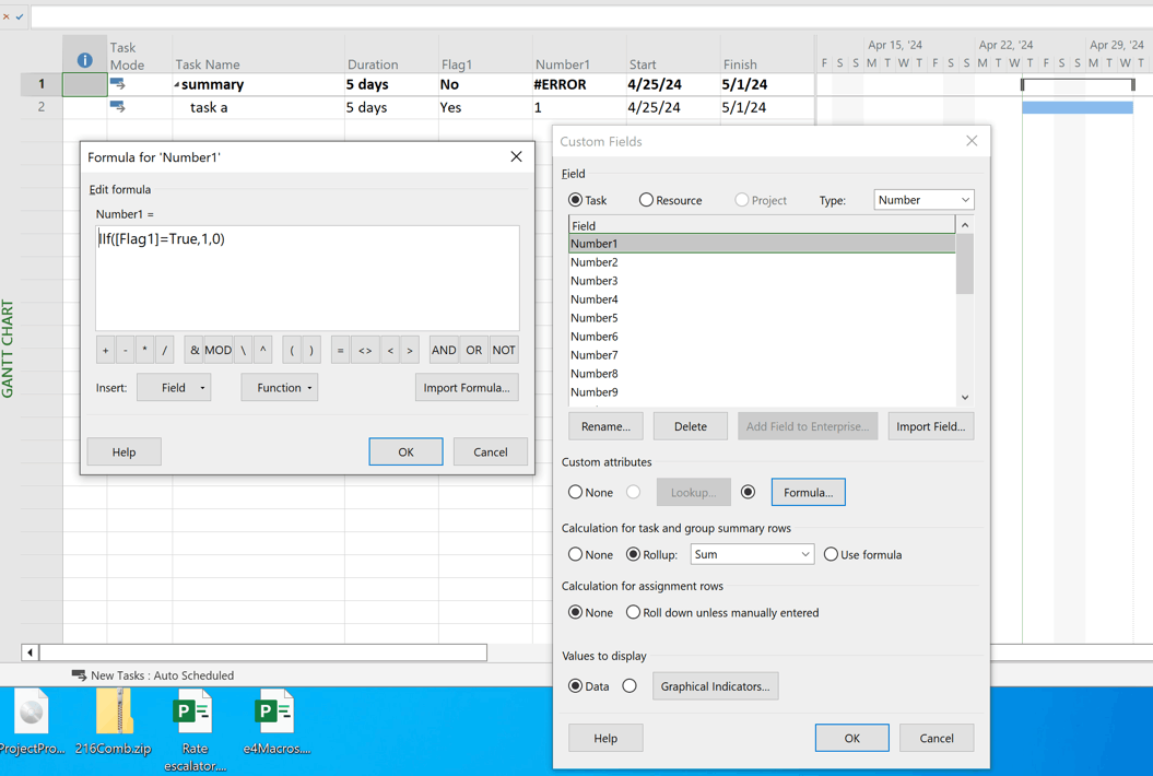 I then performed the identical test using an earlier version of Project (Project Pro 2010). Upon closing and re-opening the file, the summary line value for the customized Number 1 field is auto-calculated without further operations (i.e. edit or forced calculate). A #ERROR on the customized Number1 field never occurs.