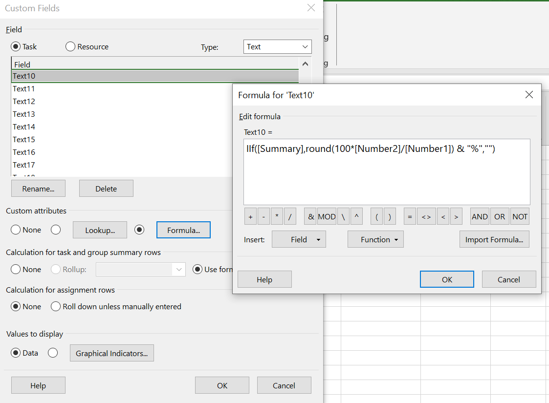 Conclusion: There is a calculation anomaly in current versions of Project for some custom formula configurations. It is not a bug as it does not adversely impact Project's functionality and can easily be resolved with a forced calculation or edit. For users who may consider this unacceptable I suggest you submit a request through Project's feedback portal.