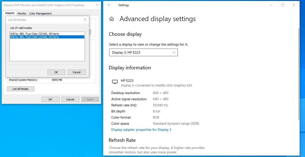 I just added a third monitor and when doing so, one of the other 2 greyed out and I no longer have the ability to change the display setting. Its hard coded at 640x480. I have tried going to advanced and 'list all modes' i only have 640x480 options. thoughts?! Please see attached. Its also connected via Display port.