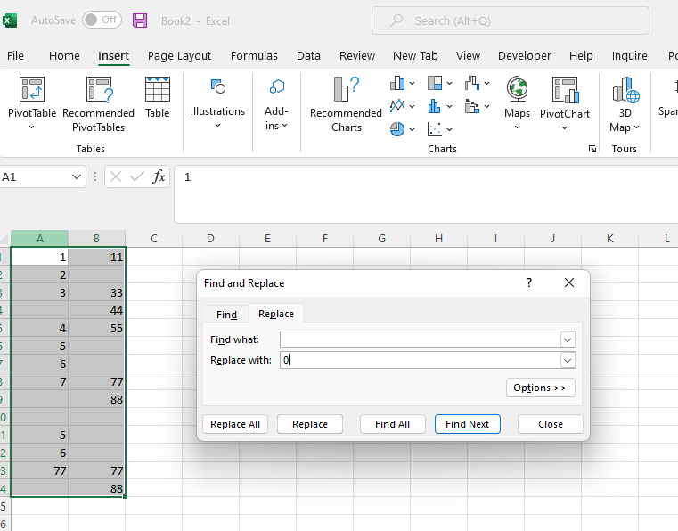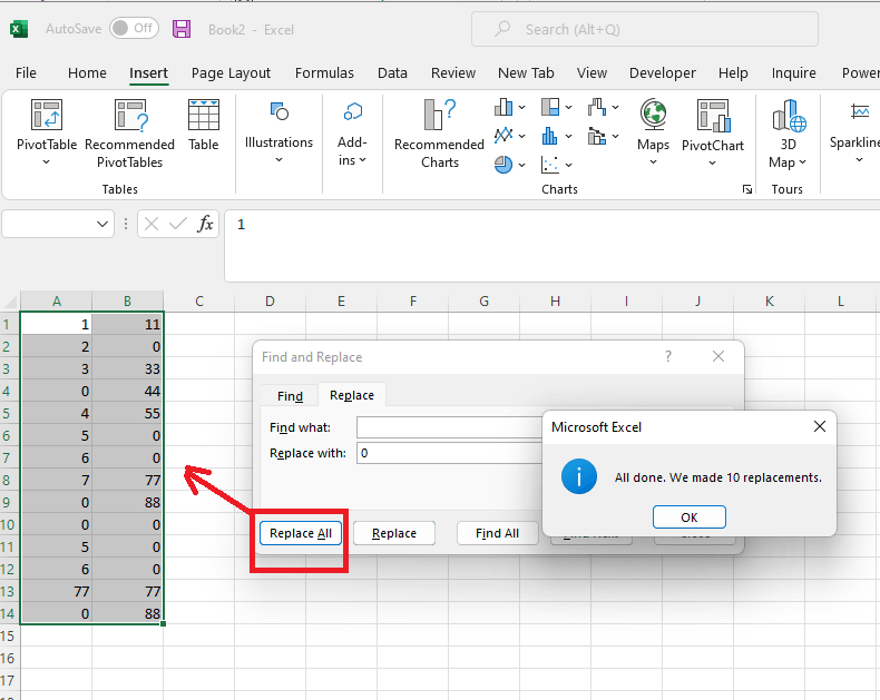 Excel will now go through the selected range and replace all empty cells with zeros.