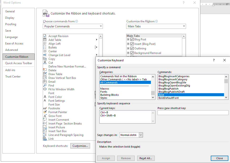 If you locate the Bold command in the Customize Keyboard dialog box, which shortcuts, if any, are listed there?