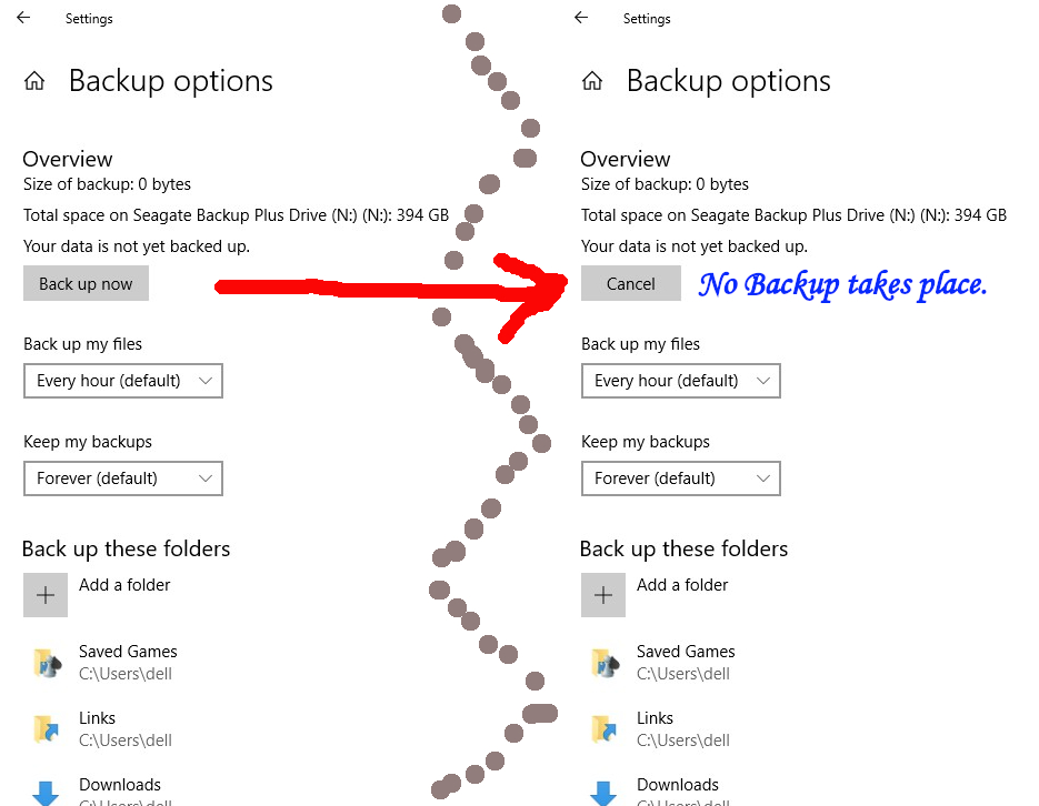 On clicking "Back up Now", a "Cancel" button appears after a few seconds with no back up having taken place.