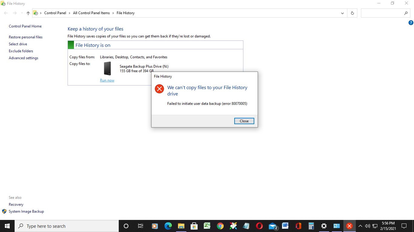 For the past few days, File History on my Windows 10 Home (20H2) has stopped working.