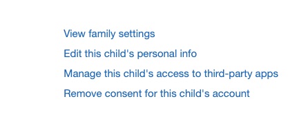 When I repeated the process and signed in as myself again (parent account) I had a list for changing the 3rd party permissons for all the children’s accounts