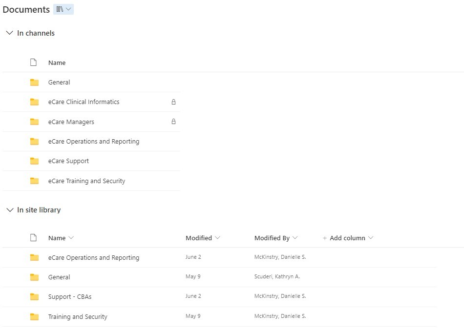 In site library sections contains all Public Channels folders but not Private Channels folders. And it also contains all folders/files created from the SharePoint site, for example, folders/files created with "+New" from ribbon will show in In site library section.