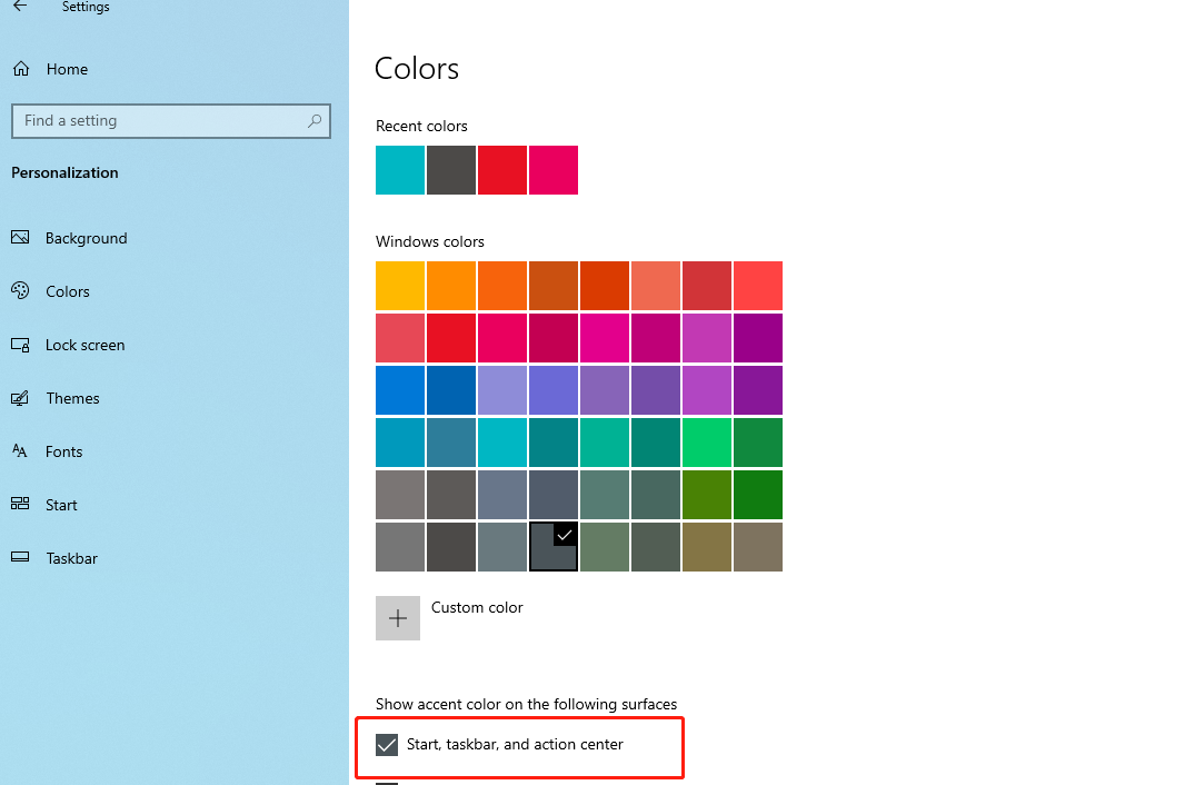 Settings-Personalization-Colors-Change the color mode to Custom or Dark (only dark Windows mode can change the taskbar color)-Choose your color-Tick Show taskbar accent color