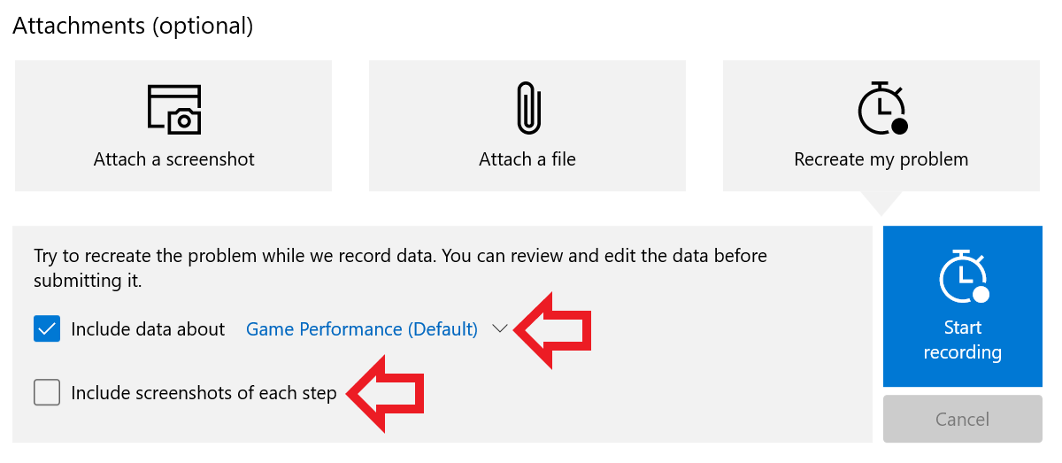 - Under the "Attachments (optional)\Recreate my problem" tab, deselect "Include screenshots of each step" andselect “Include data about” with the default value. Screenshots may cause stutter while recording, leading to false positives in the performance capture.