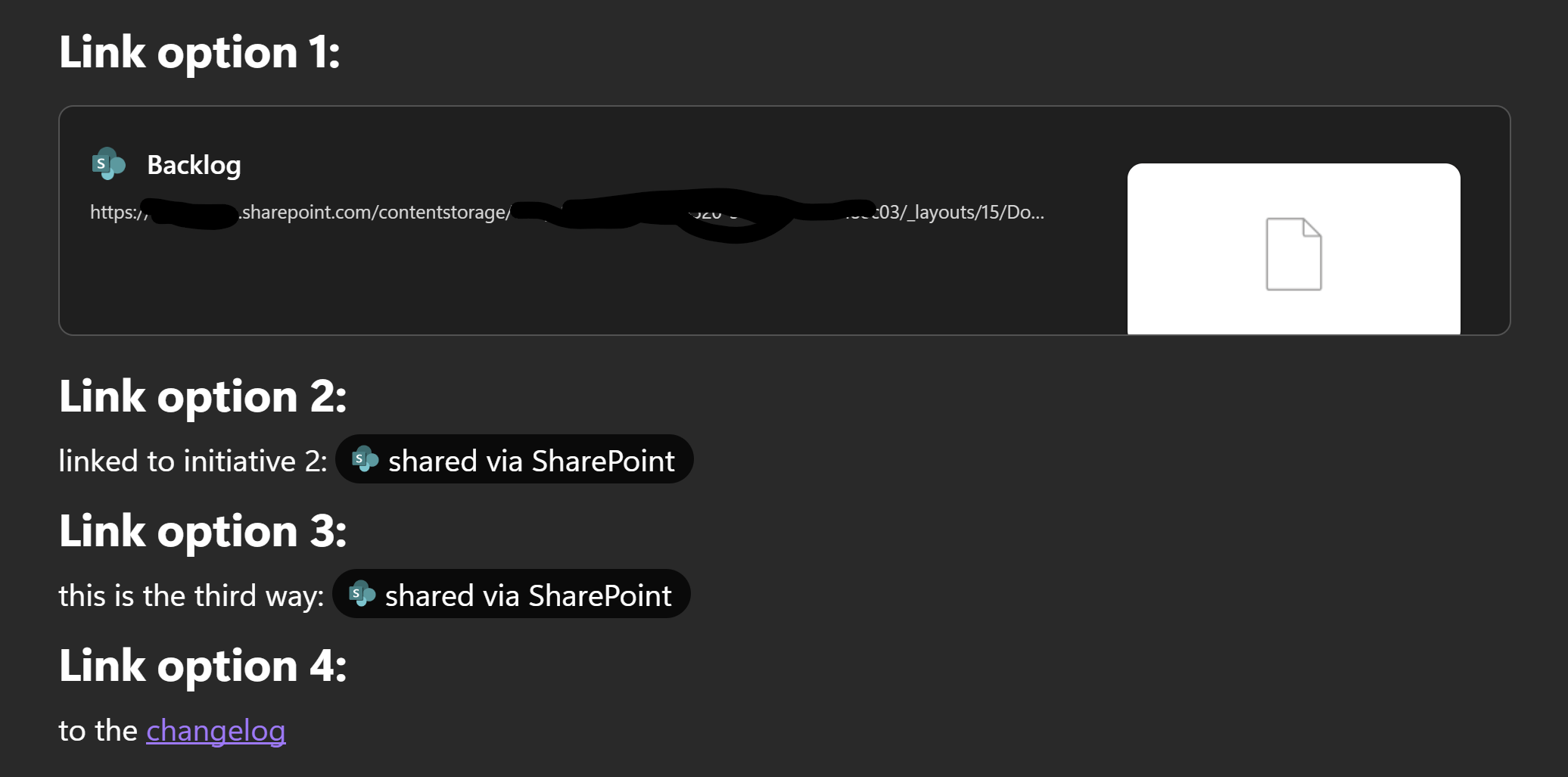 2 and 3 both seem to do the same (like it's the same solution). And the good: it is an inline link, which stays within the Loop app (albeit in a new tab, which if I wanted that, I would handle that myself). But... both options make a link button "shared via SharePoint" (and have no option to rename to the actual URL). Am I overlooking a way for that link to have a different text field?