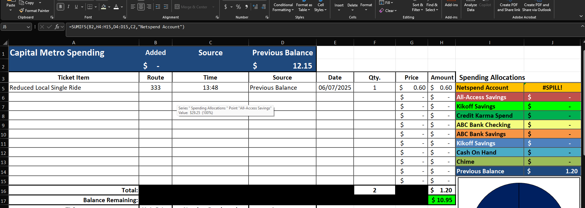 Sure thing. Essentially, the purpose is to track spending on both ticket sales and top-ups through the Cap Metro app. You can either purchase individual tickets via the balance on the app or one of the account sources listed on the right. Therefore, I'm developing formulas to track which source the top-ups come from, and or the individual purchase amounts come from. The screenshot you saw before was a bit outdated and was the wrong one. The one below shows the use of the new formula listed in my latest reply. I'll show you the formulas for the amount calculations for each account source. Therefore, if I top up on the app with an amount from the Netspend account and or I make individual ticket purchases through that account, I want both the top-up amount and the purchases to be totaled. See the latest screenshot and formulas below.
