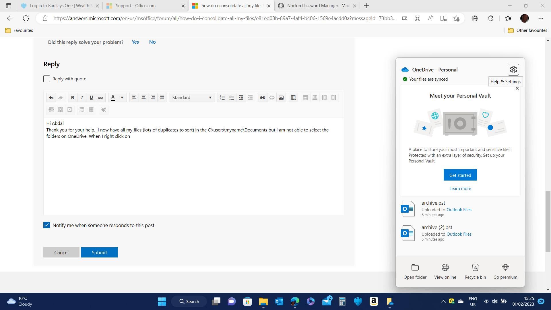 You can consolidate your files by copying and pasting the files from iCloud and OneDrive to your "c:\Users\name\documents" folder. To back up your files to OneDrive, you can set up OneDrive to automatically sync your "c:\Users\name\documents" folder to the cloud. You can do this by following these steps:
