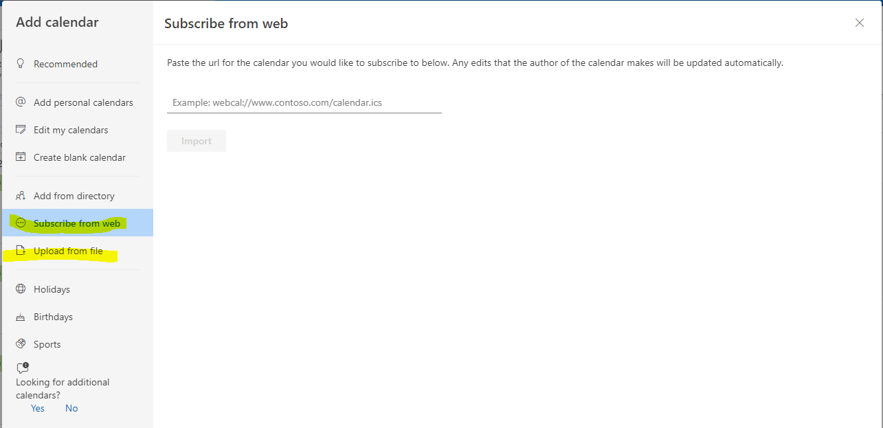 - In Add calendarwindow, you can try to Subscribe from web options. And you also can choose Upload from file with your .ics file saved on local drive.