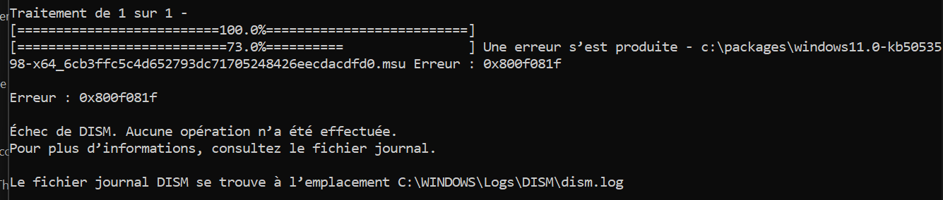 I have this message when I try to run the command : "An error occurred - c:\packages\windows11.0-kb5053598-x64_6cb3ffc5c4d652793dc71705248426eecdacdfd0.msu Error: 0x800f081f"