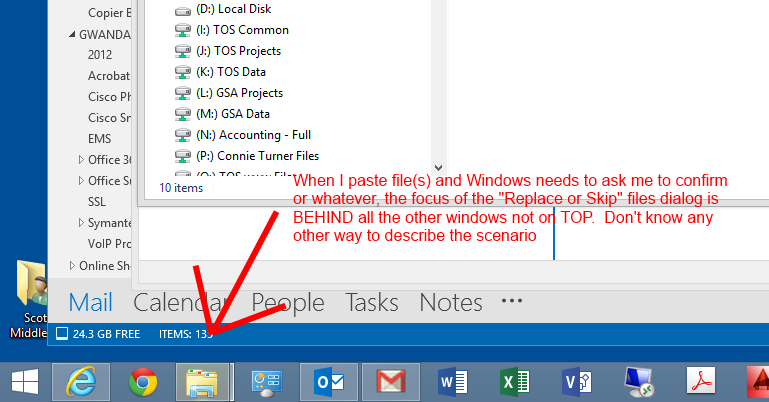 So my BIG question, complaint, support issues...whatever you'd like to call it.....is: Why does the "Replace or Skip Files" dialog not FOCUS to the top off all windows when it appears? Is there a Windows Update KB or Hotfix that I have not been able to find to resolve this issue or is it for some ODD reason by design??