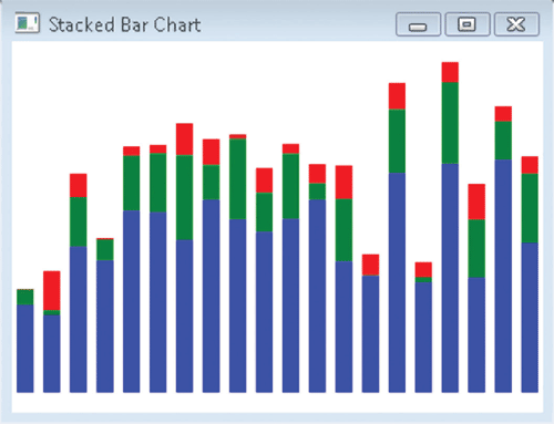 The primary colors are a bit garish, but you can easily tone them down by putting the StackPanel in a single-cell grid, which then contains another Rectangle to overlay the other three. This fourth Rectangle is colored with a LinearGradientBrush with various degrees of transparent white. The StackedBarChartWithGradientBrush project uses this technique for the visuals in Figure 5.