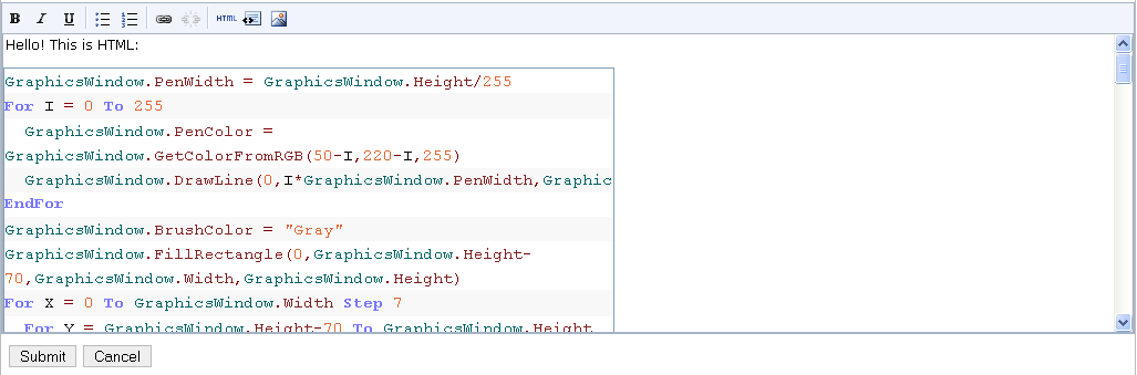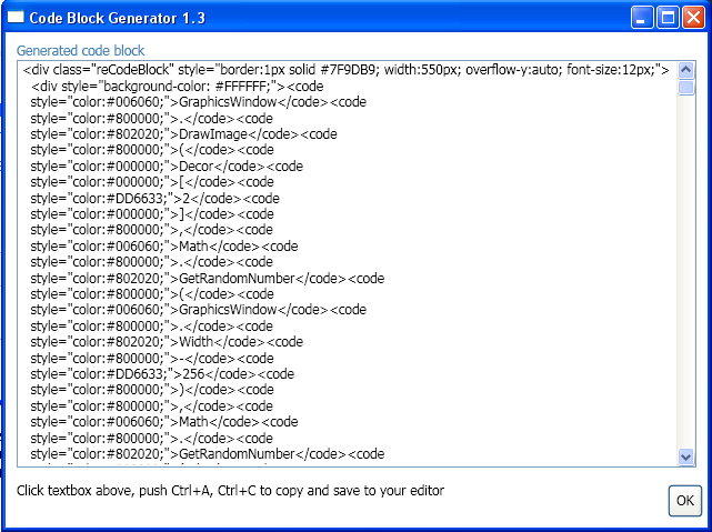 So first, you copy/paste your code into the 'Paste source code below' box. The default options are pretty good, and unless you know what you're doing, I would keep them at their current values. I often click 'Preview' just to be sure that it looks good and that no big bug happened (I've never seen one occur yet, though =^) ) . So after doing that, you can click the 'OK' button. After it finishes processing your code, you should see a giant string of HTML. Those new to programming, don't freak out! It should look something like this.