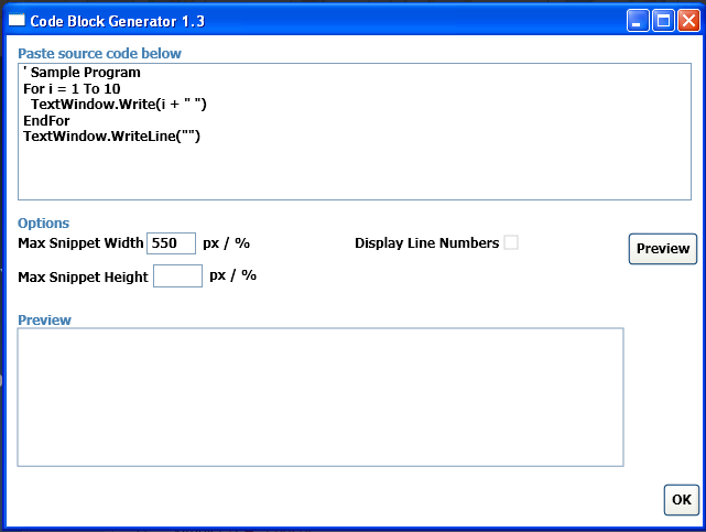 I wouldn't check the 'Display Line Numbers' box because if you do that, it will count the line numbers as part of the code in the end result. So then, others could end up having to erase all the line numbers after they paste into SB. That would be bad.