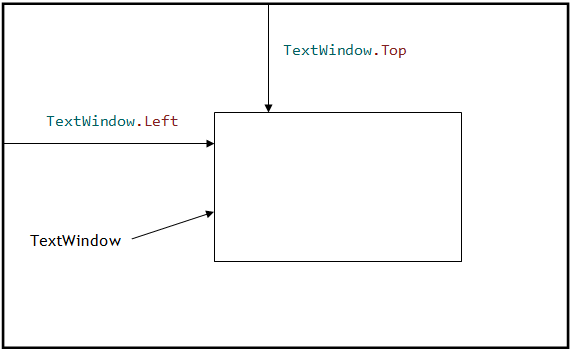 This program illustrates use of all the properties of the TextWindow object. The Title property is set as are BackgroundColor and ForegroundColor. We use the WriteLine method (preceded by CursorLeft and CursorTop) to position the text in the window. Left and Top position the window on your screen.