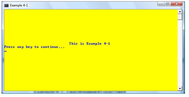 ' Guide to Small Basic, Example 4-1TextWindow.Title = "Example 4-1"TextWindow.BackgroundColor = "Yellow"TextWindow.ForegroundColor = "Blue"TextWindow.Clear()TextWindow.Left = 200TextWindow.Top = 100TextWindow.CursorLeft = 30TextWindow.CursorTop = 10TextWindow.WriteLine("This is Example 4-1")