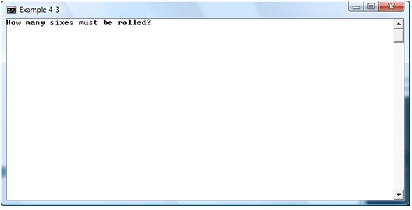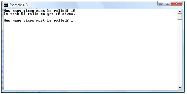 Theoretically, it should take 60 rolls (since each roll has a 1 in 6 chance of rolling a six). At this point, I can type in another value. Try several values. Stop the program when you are done.