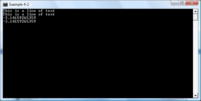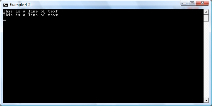 There are two methods used to write information in the text window. We have used the WriteLine method. It writes the information to the window and appends a new line character. Any subsequent output methods start on a new line. WriteLine can also be used to write a blank line using: