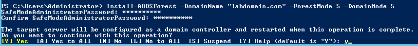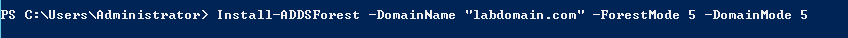 Install-ADDSForest -DomainName "labdomain.com" -ForestMode 5 -DomainMode 5
