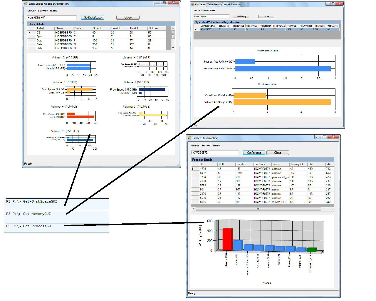 I've created a script which gives details of Disk, Memory and Process and its represented graphically.