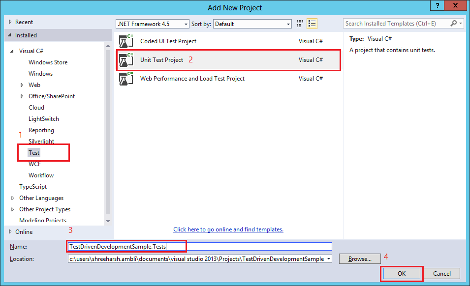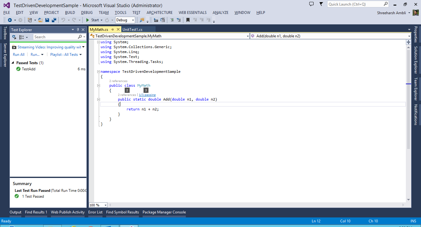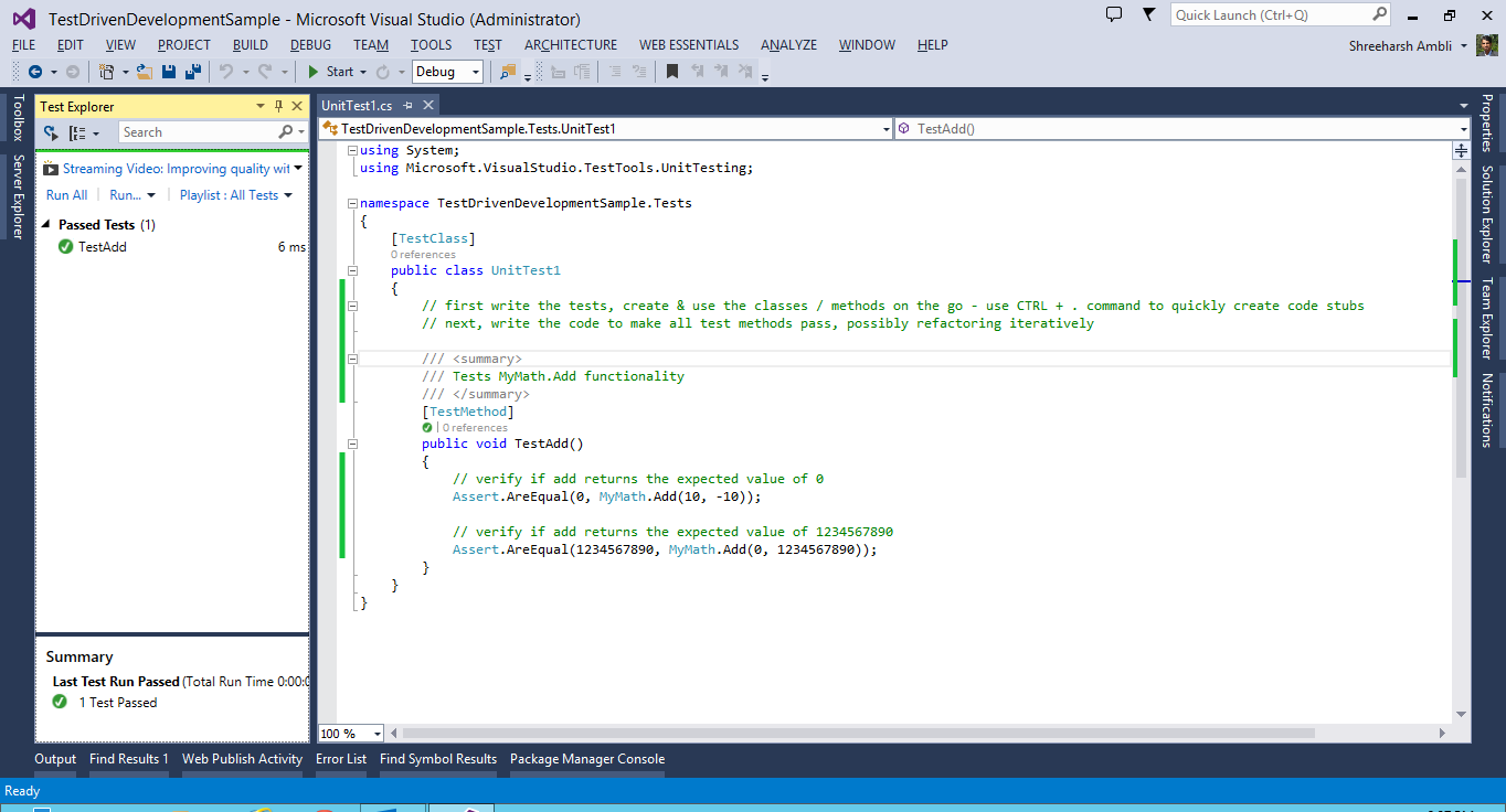 Note: don't forget to add a reference to the C# project in your Test project!Add the Test method and write code to essentially fail the target method. Ideally, it should cover all possible flows / scenarios (we can see the test passing below because we already had the functional code in place but you will get this test as failed initially):