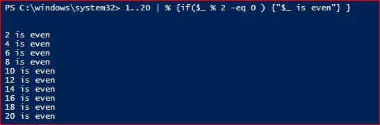1..20 | % {if($_ % 2 -eq 0 ) {"$_ is even"} }