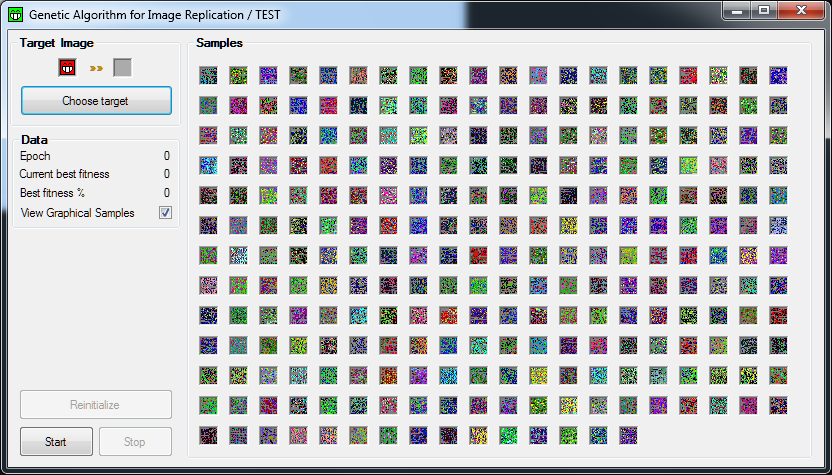 The button "Choose target" allows the user to choose an icon, which will be the image we want to reach evolving our solutions. One hundred PictureBox are dynamically created to contain the output of each GAImage. Random GAImages are generated, and we can see none of them has apparent correlation with our target (lots of chaos in them!). Still, evaluating them, we could identify the better samples, and start our loop of breeding.