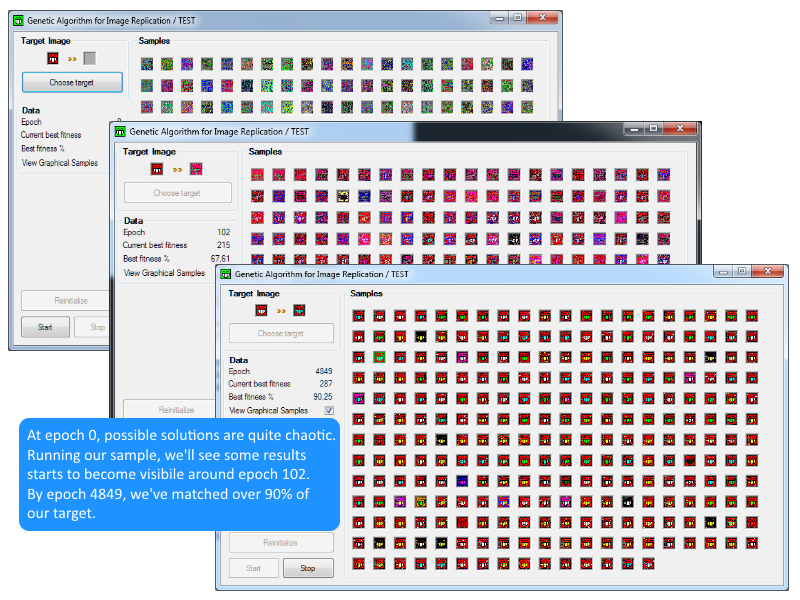 We populate a start list composed of GAImages, initializing them with the target byte array (which, as we saw, is useful for fitness calculation), and passing the pool from which our bytes could be drawn. Please refer to the GAImage code above for details on the initialization procedure.