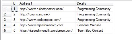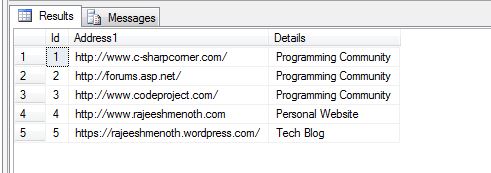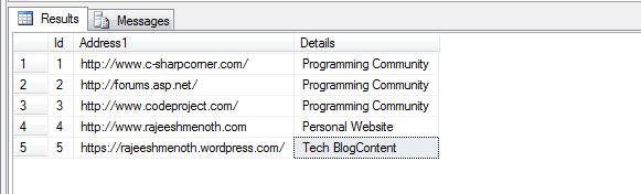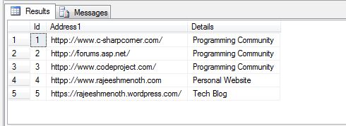 The given table contains incorrect address in the "Address1" column like httpp://www.c-sharpcorner.com/, so http is appended with an extra p ("httpp"). So we can update those values in a single query. How? Microsoft SQL Server provides Replace function to replace particular data.