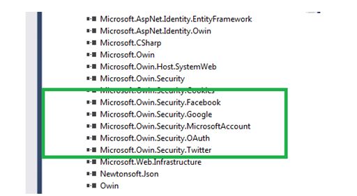 OWIN is helps to Facebook, Google, and Microsoft Account and Twitter authentications. It is interact as a middleware for those authentications. Below diagram shows assembly for Facebook, Google, and Microsoft Account and Twitter.