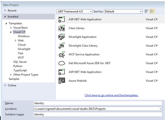 Open new project in visual studio and select Visual C#. In Visual C# select ASP.NET Web Application and give project name then click OK.