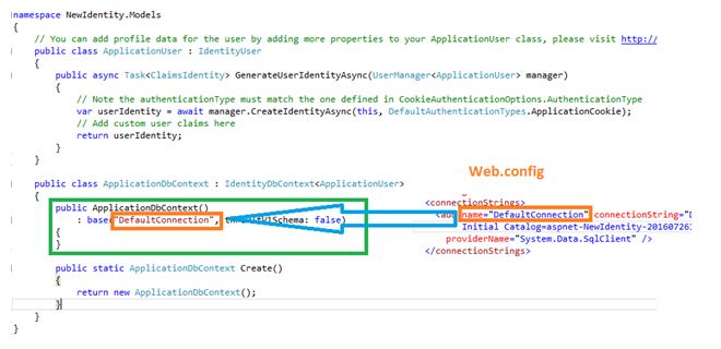 Right click on ApplicationUser class and go to definition. Now e can see the Web.config connection string name placed in inside of ApplicationDbContext class. Here we connect the database using Web.config connection string.
