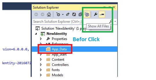 Our db created an “.mdf” file in App_Data folder. When you see App_Data folder we do not see any file. Go to solution explore on top of right side, click all file icon. After click all file icon we can see “.mdf” file in App_Data.