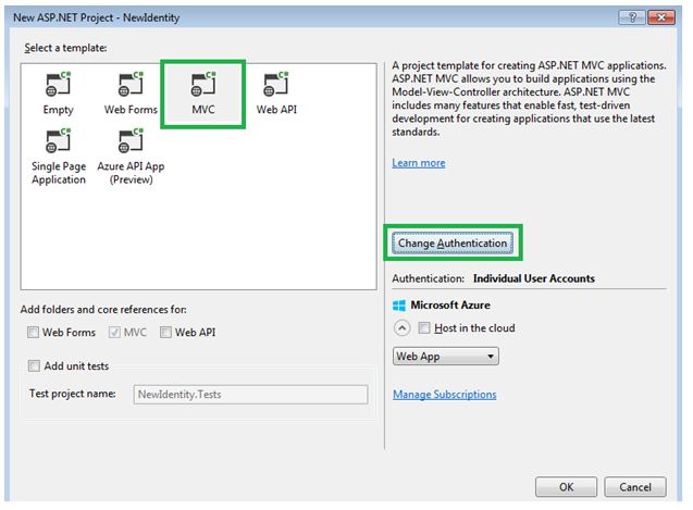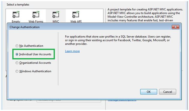 We can use different type of Authentication we can use. Now we are going to choose Individual User Accounts and click OK button.