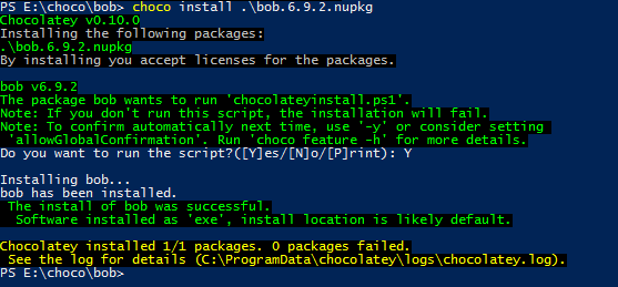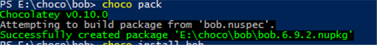 Run the command choco pack to create a chocolatey package as shown: