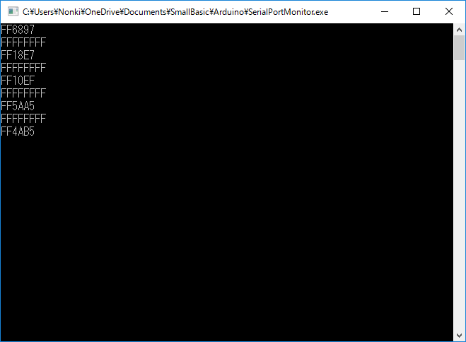 Then via serial port, Small Basic program can get controls from the IR remote control. In a program HLT038, the turtle can be moved with IR remote control buttons 2, 4, 6 and 8. And clear the screen with 0 button.
