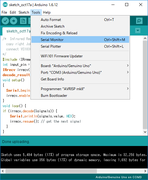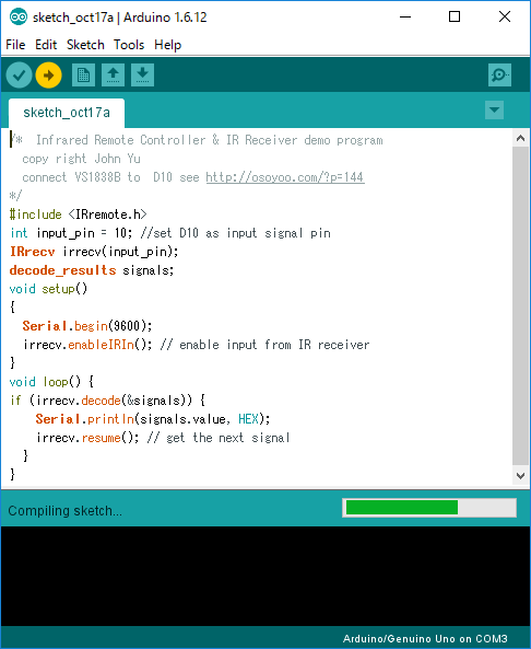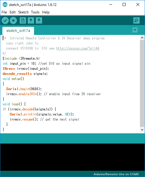 Copy Infrared demo program also from http://osoyoo.com/2014/12/08/decode-infrared-remote-controller-with-ir-receiver-vs1838b/ and paste it to the IDE as a sketch.