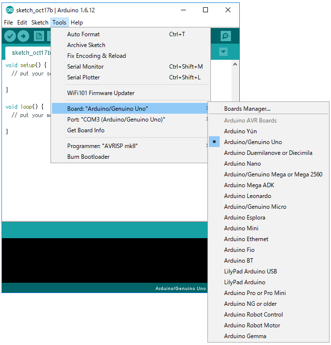Select Arduino/Genuino Uno from [Tools] [Board:] menu.