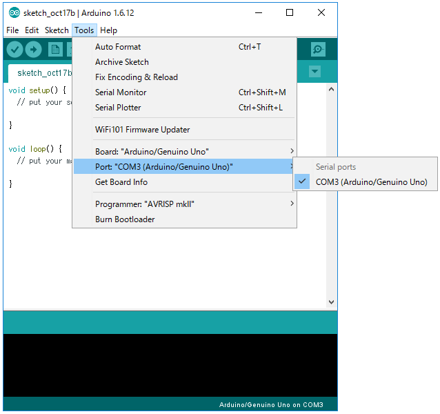 Select COM3 (Arduino/Genuino Uno) from [Tools] [Port:] menu.