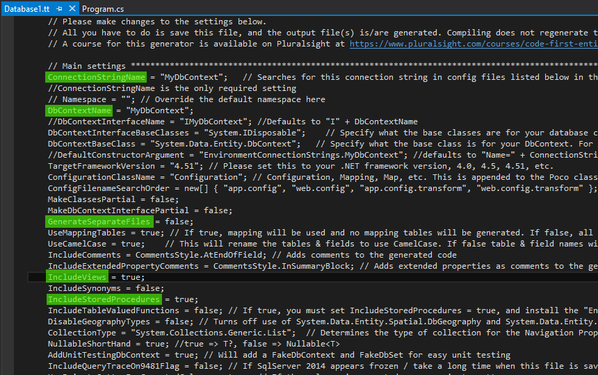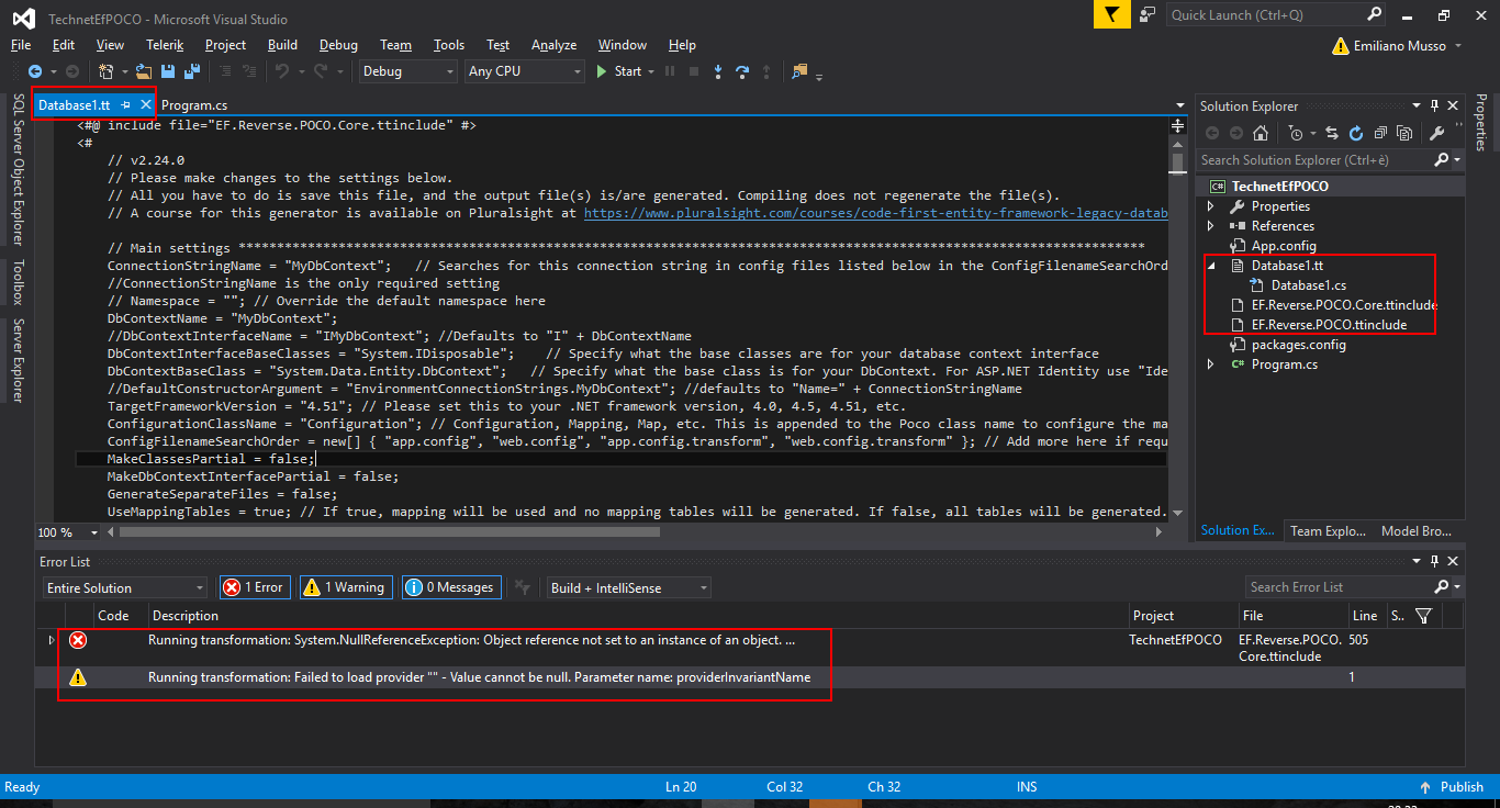EntityFramework Reverse POCO Generator will include several files into our solution, The ones on which we will work directly will be template file (Database1.tt in the article) and - secondly, and only if required - on the class file linked to it (Database1.cs in the article). That file will contain, after the correct template configuration, the DbContext and the entire entities list, with their mappings. Please note that, the first time we will visualize the T4 files, the IDE warns us about a null reference error. That happens because the template need a particular connection string to work properly, and that string must be present in the App.config file.