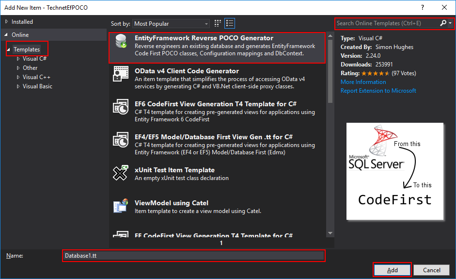 In all probability, EntityFramework Reverse POCO Generator will be the first result of the Template list. If not, it will be sufficient to search for it typing parts of its name into the window's search bar.
