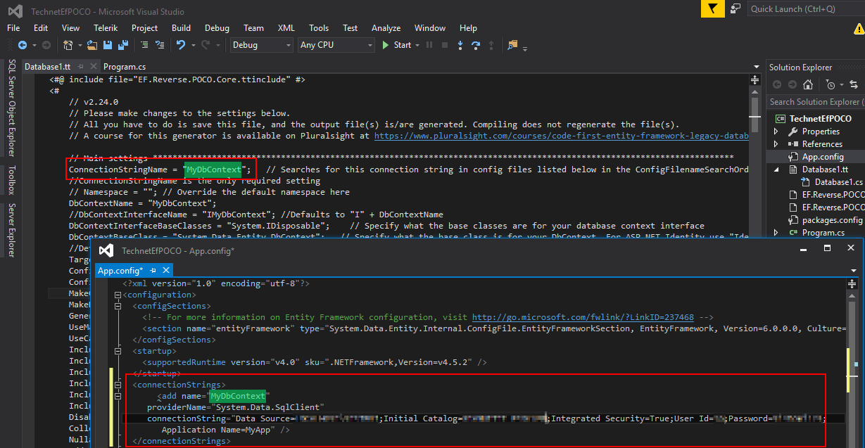 Obviously, there is the need of customizing it with the real data from your database. It's important here to assign to the connection the same name which appears into the ConnectionStringName parameter from the T4 file, which is a value the developer can modify.