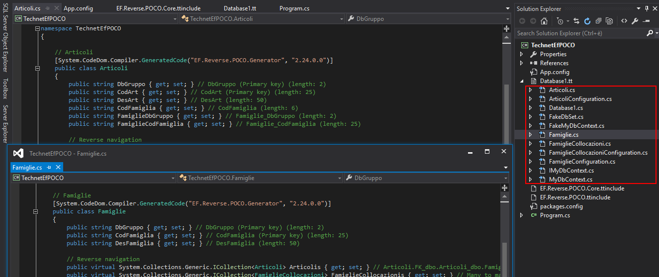 In Database-First case, the solution will be easy: we'll open the EDMX model, simply updating it by selecting the entities to add or remove, letting to EF the task of remodeling the classes. In Code-First, beyond the manual operations we must do nonetheless, it can be useful to have a tool which helps us in automate POCO (Plain-Old CLR object) entities creation, in order to make a little bit easier and faster (and gradual, too) the implementation of those classes we will need in our projects. And here comes in handy a great solution made by Simon Hughes.