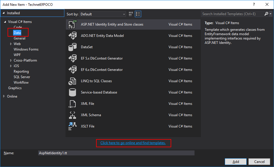 From our solution, after installing Entity Framework (6.x o 7.x version), we'll proceed in adding a new item. Go to the «Data» section, then click «Click here to go online and find templates».