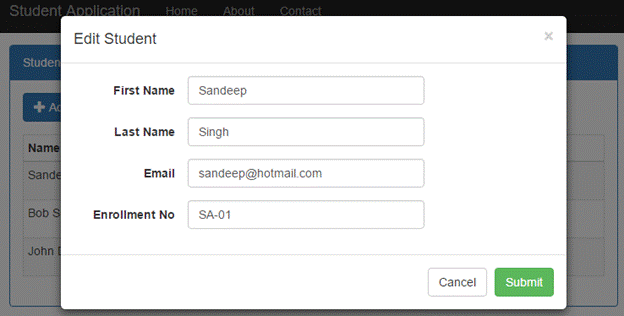 Now, run the application and click on Edit button of listing which calls AddEditStudent action method, then we get the UI as in Figure 3 to edit a student.