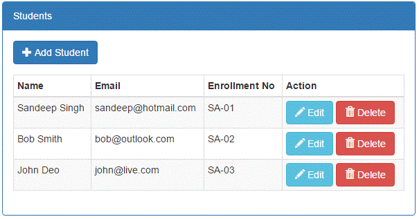 When we run the application and call the index() action with a HttpGet request, then we get all the students listed in the UI as in Figure 2. This UI has options for CRUD operations.