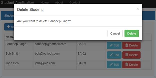 To delete a student, we follow the process of clicking on the Delete button that exists in the Student listing data then a modal popup shows to ask “Are you sure you want to delete xxx?” after clicking on the Delete button that exists in the popup view such as in Figure 4 then it makes a HttpPost request that calls the DeleteStudent() action method and deletes the student. The following is a code snippet for _DeleteStudent.cshtml.